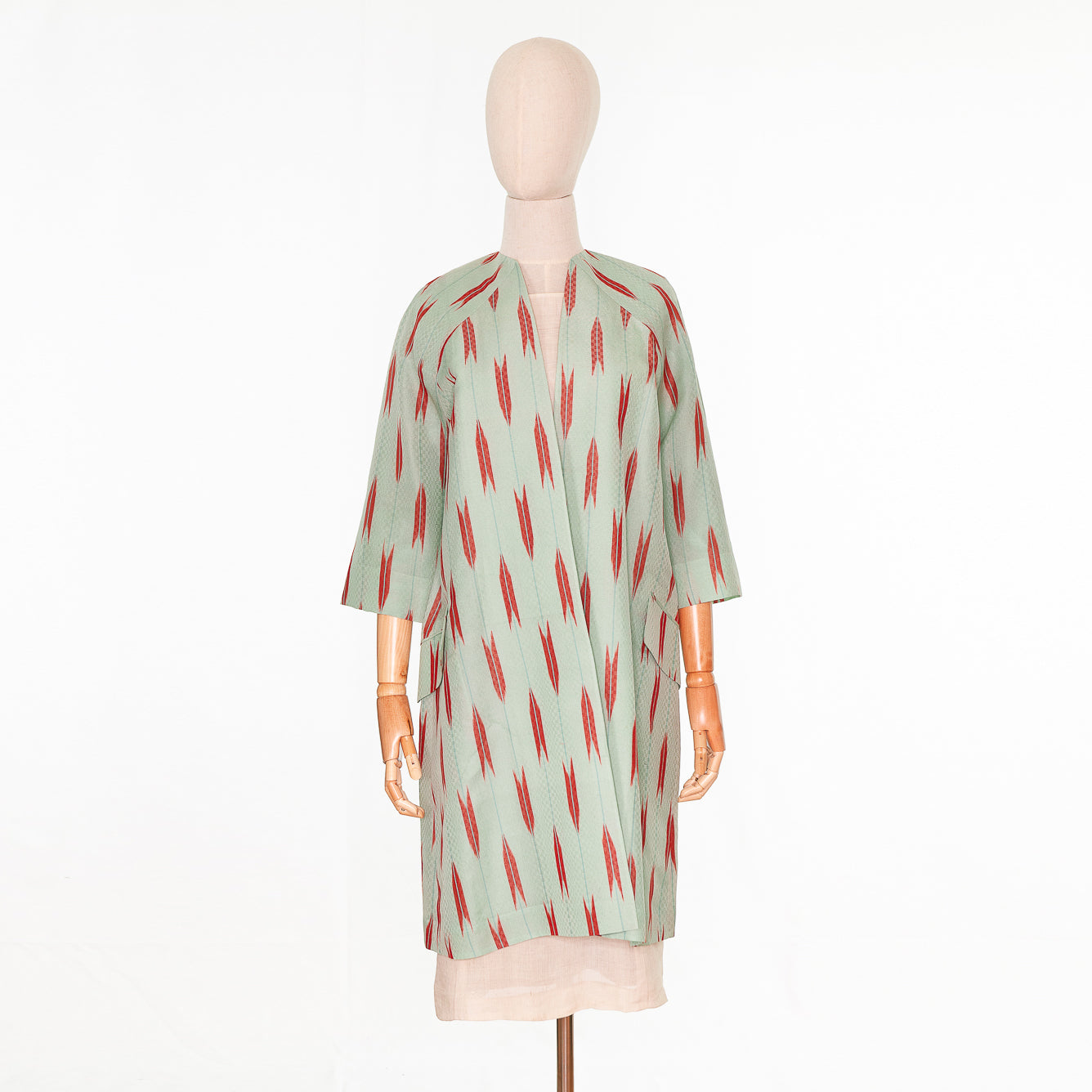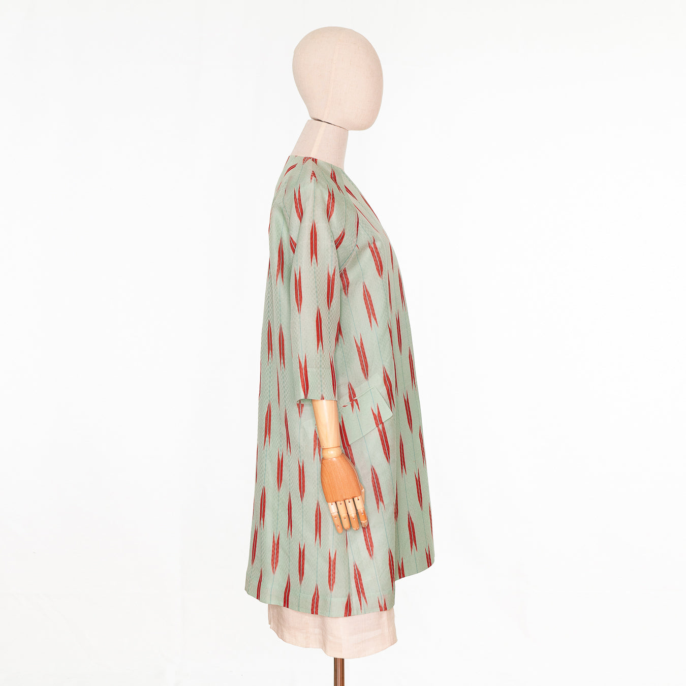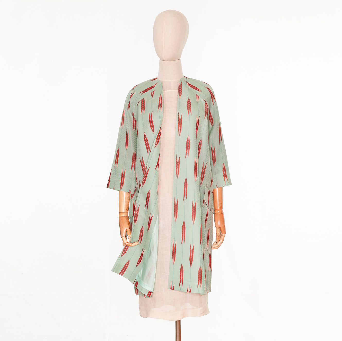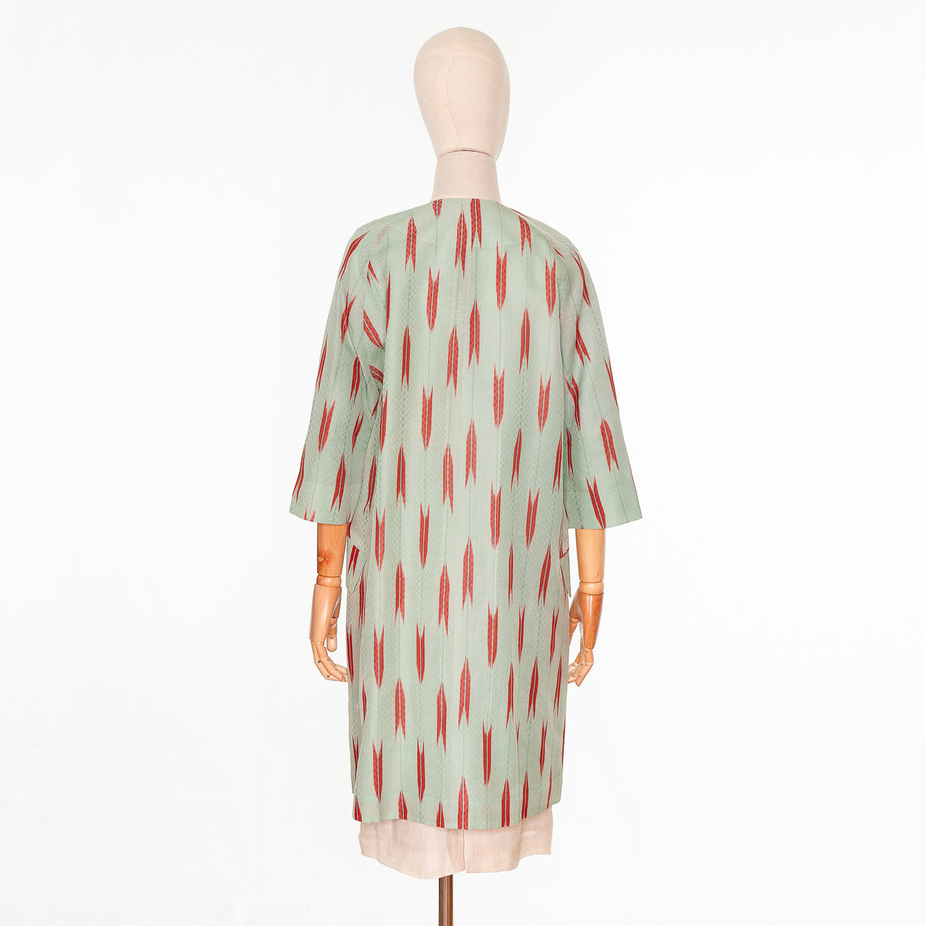 Extremely simple shape together with a contrast between vintage Kimono fabric and mono color lining are the characteristics of the design.