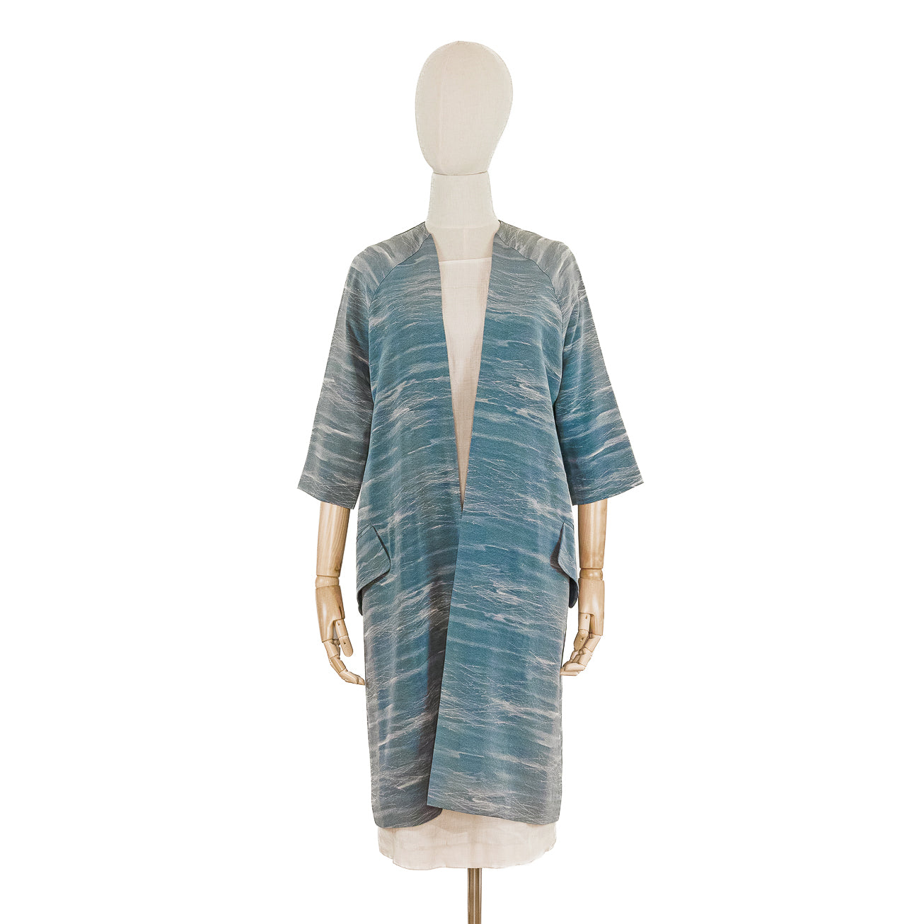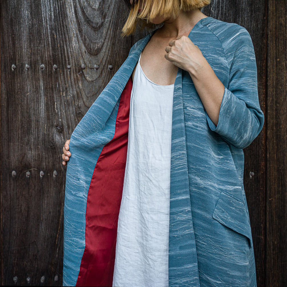 貴重なビンテージ着物をリメイクして作った一点しかないオリジナルアイテムです。ラグランスリーブの極シンプルなデザインと共にビンテージ着物生地の上品な雰囲気とポップなライニングカラーの対照がデザインの特徴です。