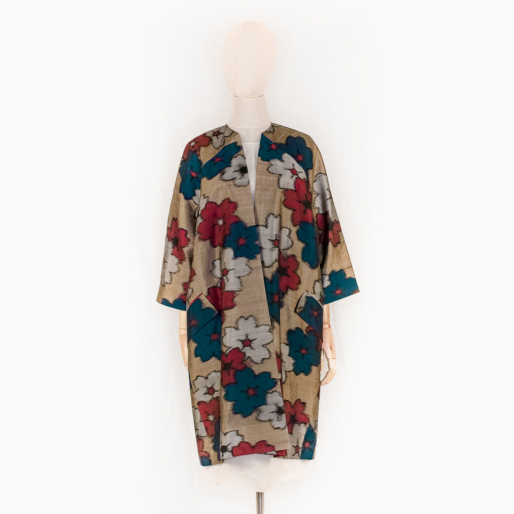 貴重なビンテージ着物をリメイクして作った一点しかないオリジナルアイテムです。ラグランスリーブの極シンプルなデザインと共にビンテージ着物生地の上品な雰囲気とポップなライニングカラーの対照がデザインの特徴です。